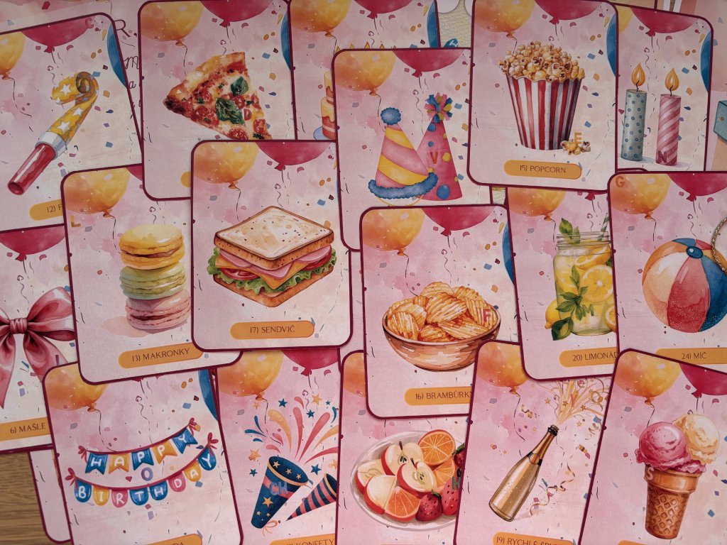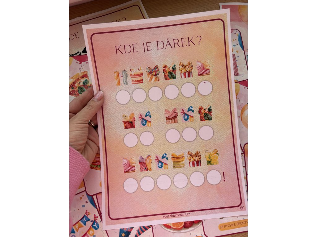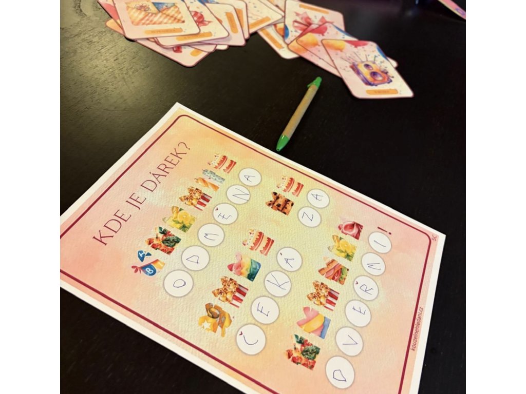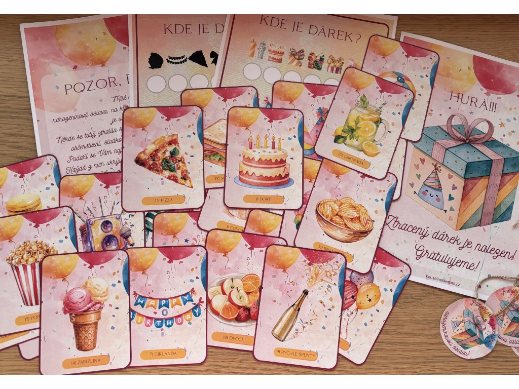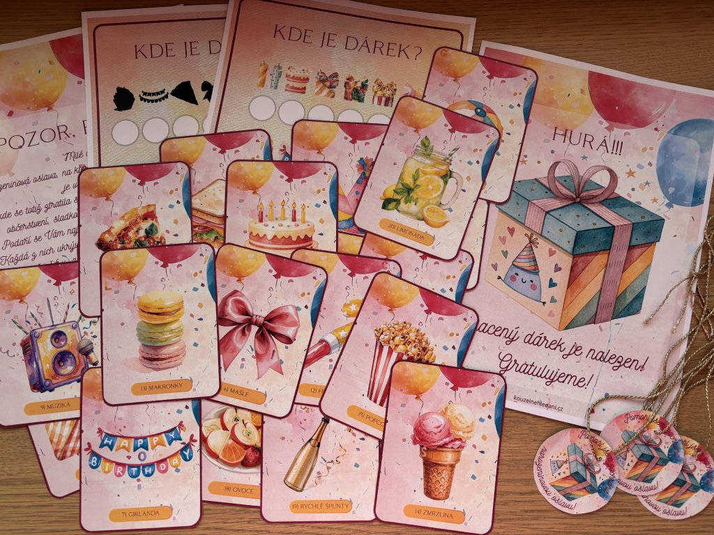 Děti musí najít 24 kartiček (obrázků s tematikou narozeninové oslavy), které jim poschováváte doma nebo venku na vymezeném prostoru. Na každé kartičce je ukryté písmenko, které pak děti vepíšou do listu s šifrovanou zprávou. Po vyřešení šifry pak děti najdou závěrečnou zprávu s obrázkem ztraceného dárku a příp. odměnu. Menší děti, které ještě neumějí samy číst a psát, si užijí hledání kartiček a písmenek v nich, s luštěním šifry jim budete muset trochu pomoct.